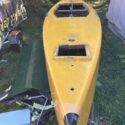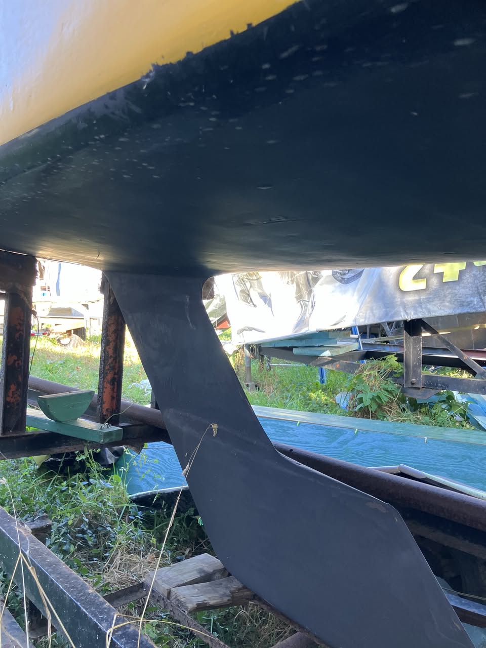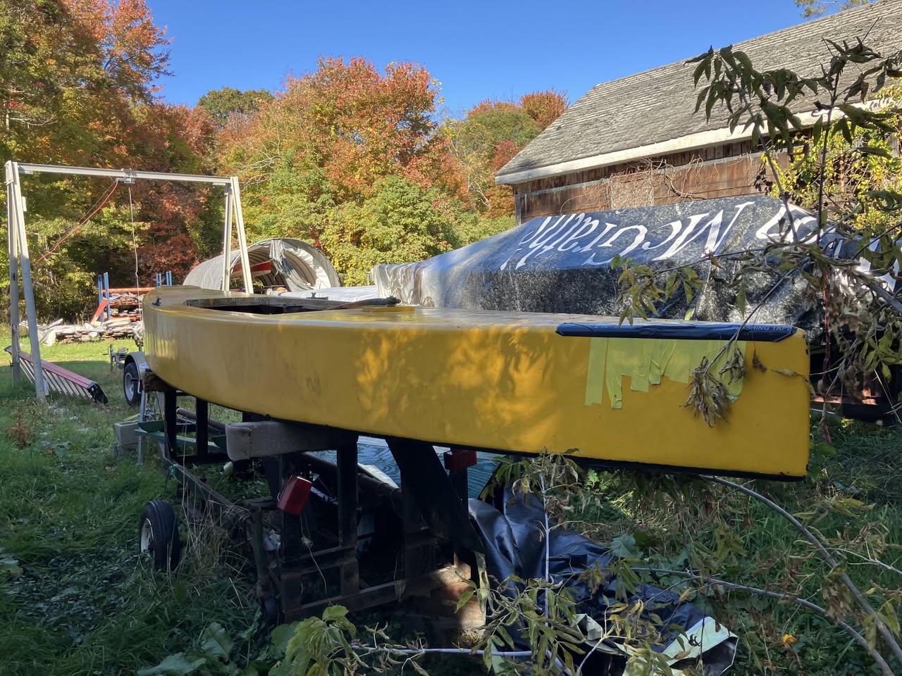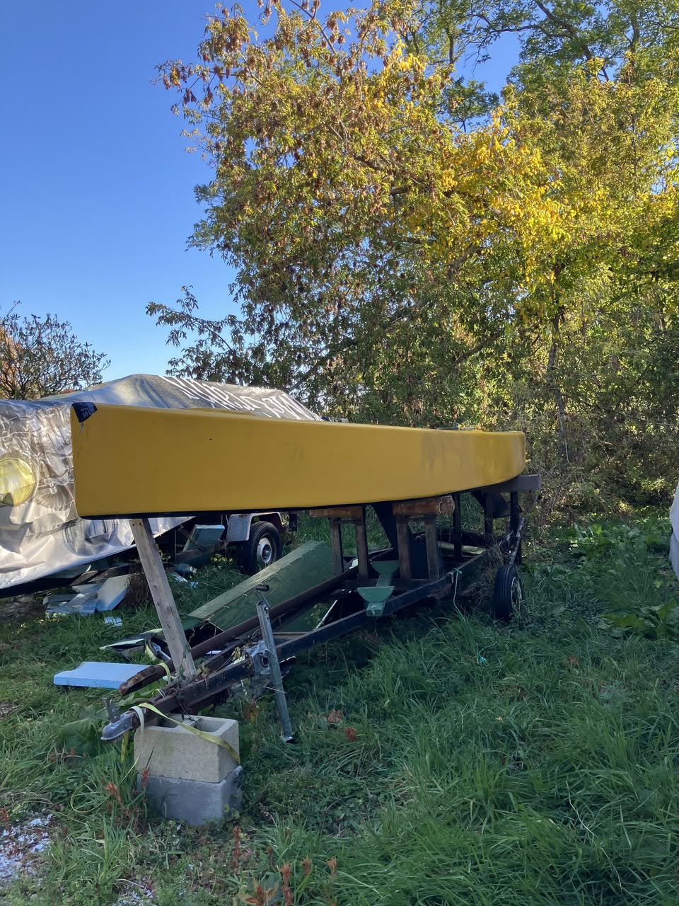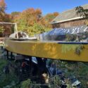 She has been re-plywooded at least once. There is some rot and soft spots that need to be cut out and replaced, all of which Milly would do without taking the mast down. Trailer is variations on the theme of frightening. Mast, boom, pole with it. Coamings damaged but usable as patterns.